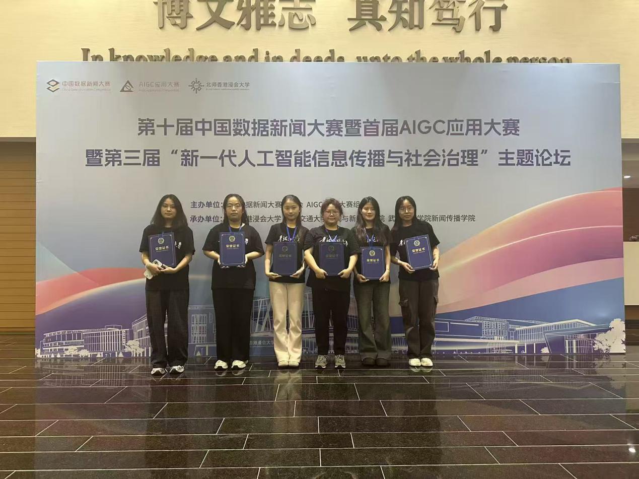 11月8日,第十届中国数据新闻大赛全国总决赛在广东省珠海市举行。我校新闻学院2023级新闻学专业本科生赵悦、严雅如、陈冬香、汪万英、郭雨漩、海田等6名学生在新闻学院教师庞书纬、陈雅琨的指导下,在众多优秀选手中脱颖而出,荣获大赛二等奖。
