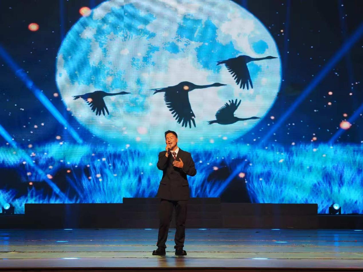 第一篇章“挺膺担当·薪火相传”。音乐学院青年教师张涵带来钢琴独奏《黄河交响曲》,激昂旋律展现黄河磅礴气势;切智尖措献上男声独唱《月亮遇大雁》,动人歌声传递别样情愫;地理科学学院等联合表演舞蹈《格桑映中华》,优美舞姿诉说对中华大地的热爱。