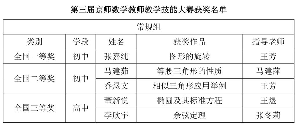 第三届京师全国数学教师教学技能大赛由大中小学数学国家教材建设重点研究基地、北京师范大学数学科学学院联合主办。本次大赛共有来自全国27个省市自治区职前组和在职组教师提交作品763项。